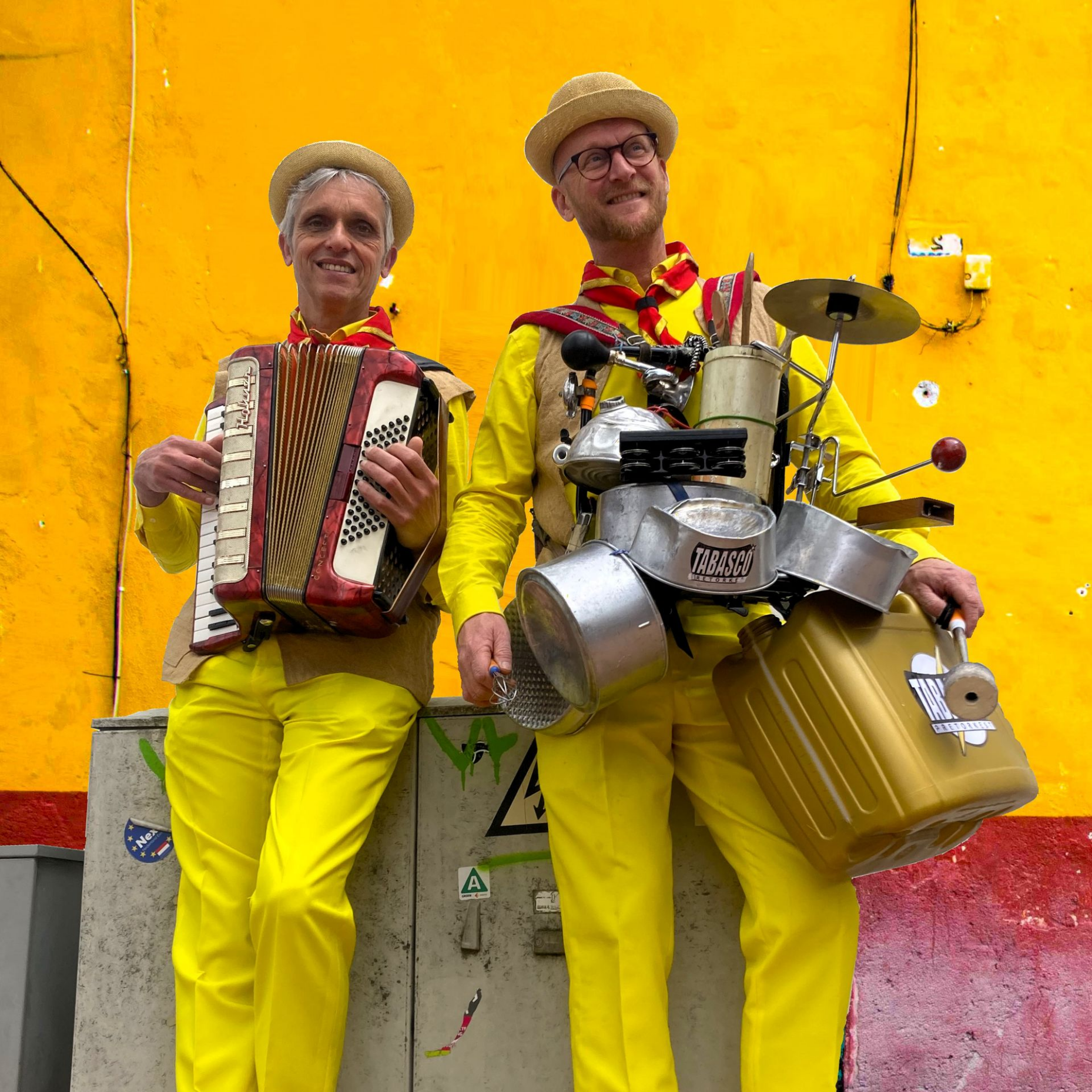 “Say Cheese” is een muzikaal duo in knalgele pakken.