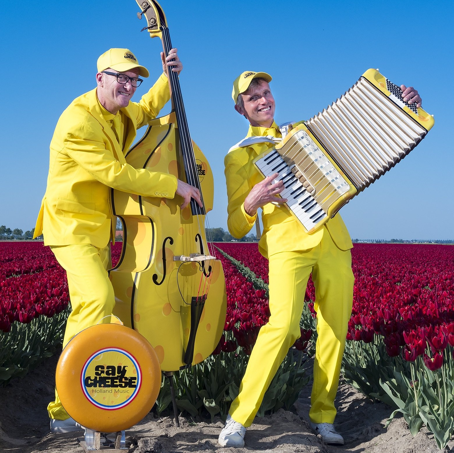 The instruments (double bass, accordion and “cheese drum”) have a yellow cheese motif.