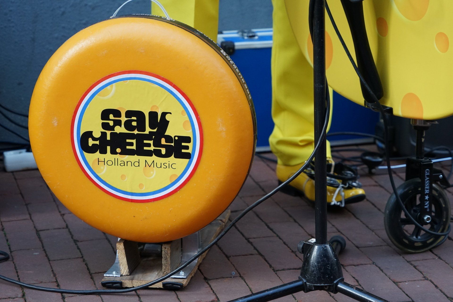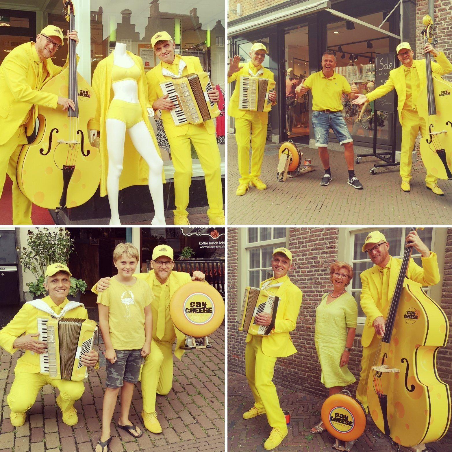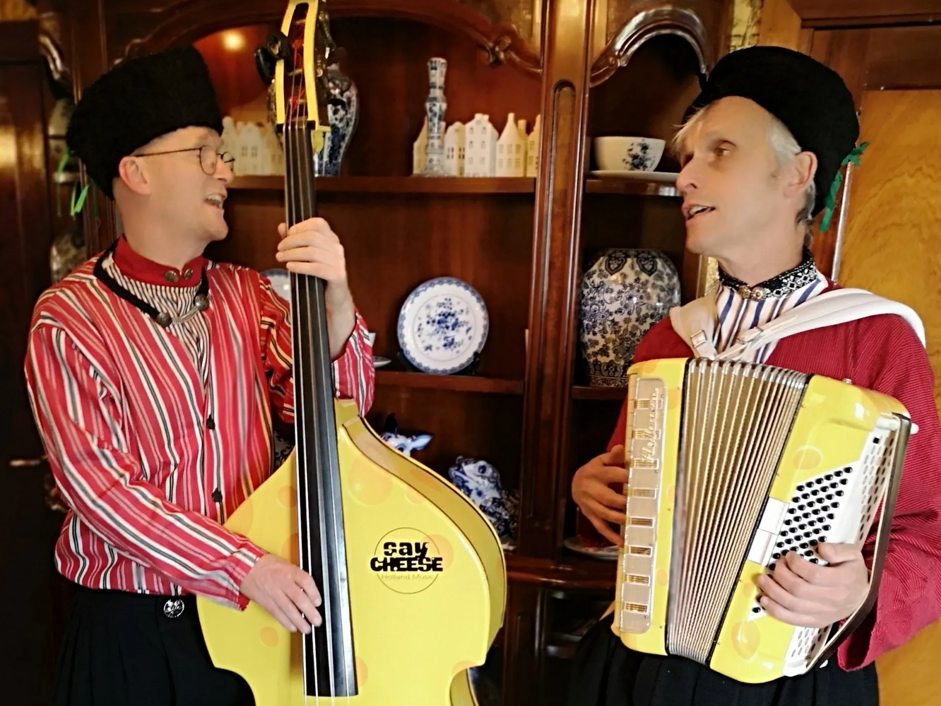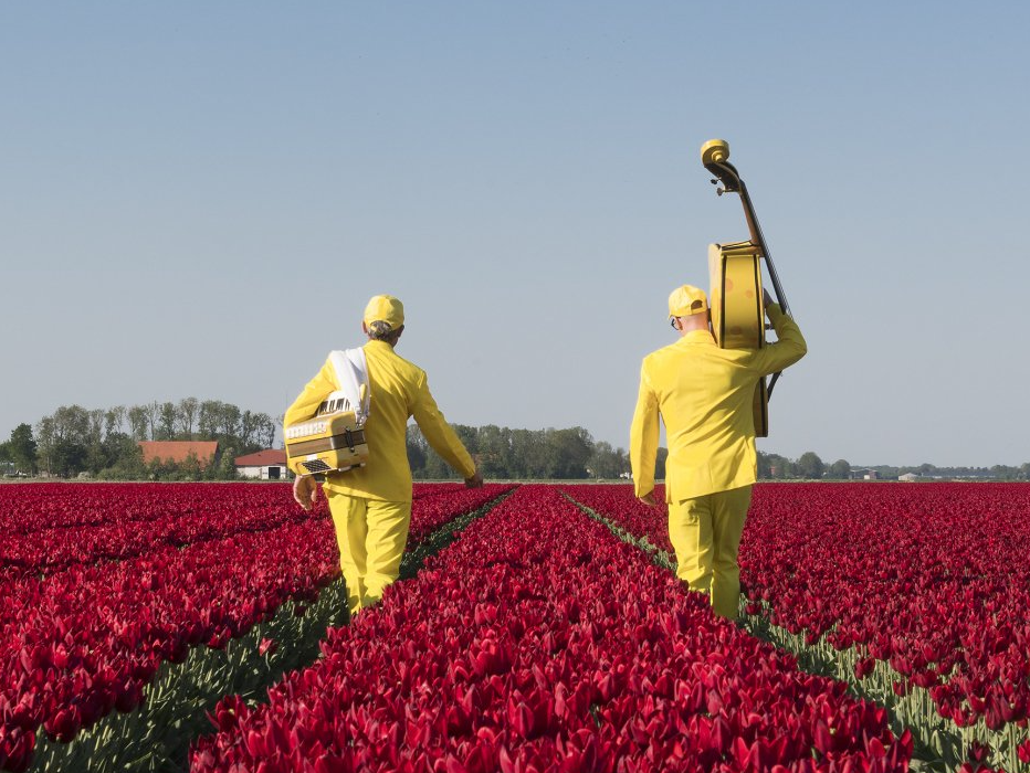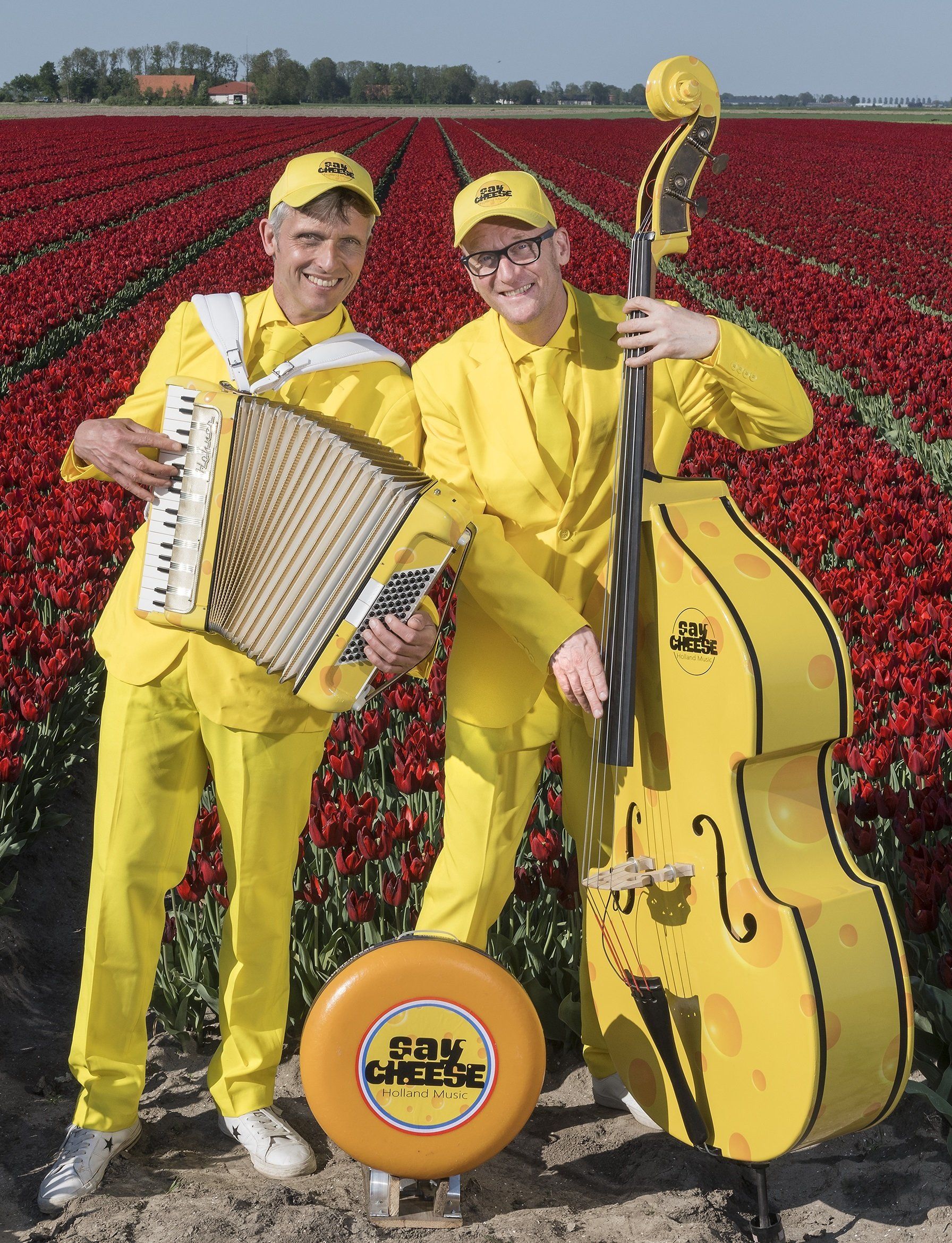 Two men in bright yellow suits. A double bass, an accordion and a small foot drum made of cheese: “Say Cheese” is a very striking musical duo!